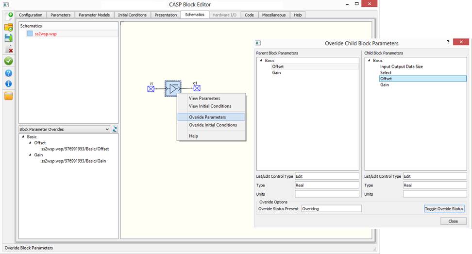· A dialog box appears where both parameters of secondary block (parent block) and child block are displayed. Select relevant parameters from both blocks and press ‘Toggle Overide Status’ button to override as shown in below figure.