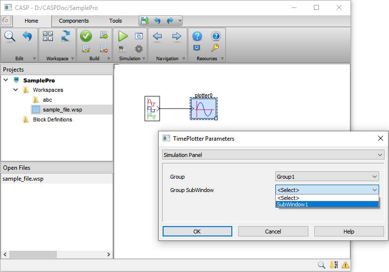 Simulation panel blocks such as plotter (in below show figure) shall assigned to simulation panel window for displaying simulation results. For adding a block to simulation panel double click on selected block to display its block parameters. Select ‘Simulation Panel’ and select Group and its Sub-Window where block has to be added. Simulation Panel shall be configured before adding any block to the panel.