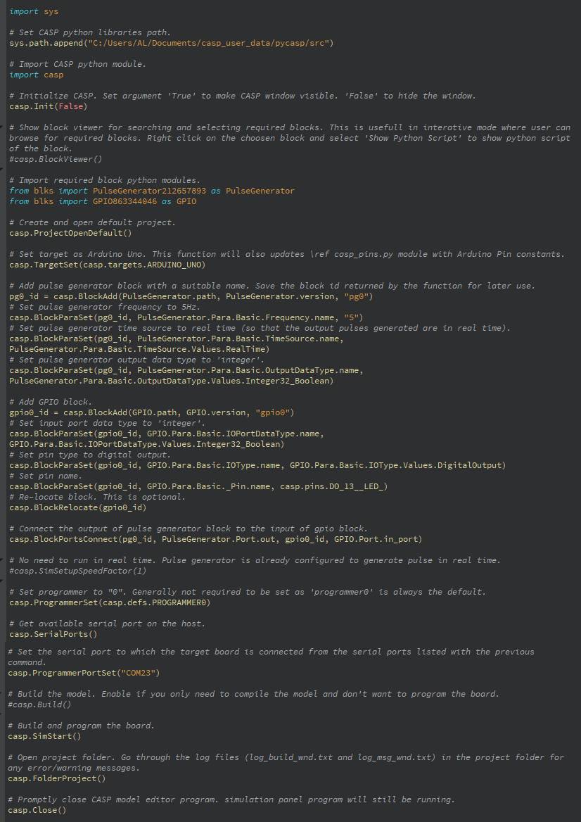As discussed extensively in previous sections, CASP uses graphical user interface (GUI) to select these blocks, connect them, configure they parameters and finally build and run them on the target hardware. Using CASP Python Libraries user can now perform all these activities through a Python script. This section discusses about how to develop CASP models using CASP Python Libraries and deploy them on the targets (supported by CASP) right from 8-bit Arduino micro-controller boards to Desktop computers. Following points are to be noted when using this method