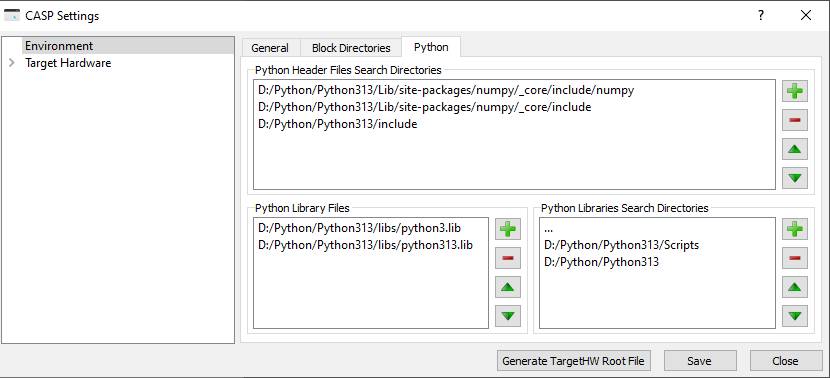 This interface can be used to add/remove python related headers, library and libraries search directories. Currently options in this page are for future use only. For setting up Python paths for each target, please refer to similar options under Setup Simulation Parameters -> Target HW -> General -> Set Target Python Paths . |