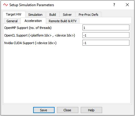 This field globally enables or disables OpenCL support during model execution. It takes two parameters separated by comma. First indicates OpenCL platform index and second indicates OpenCL device index. Value of -1 in platform index indicates OpenCL is disabled. 0 and positive values indicates OpenCL platform and device to be used by blocks having OpenCL code. |
