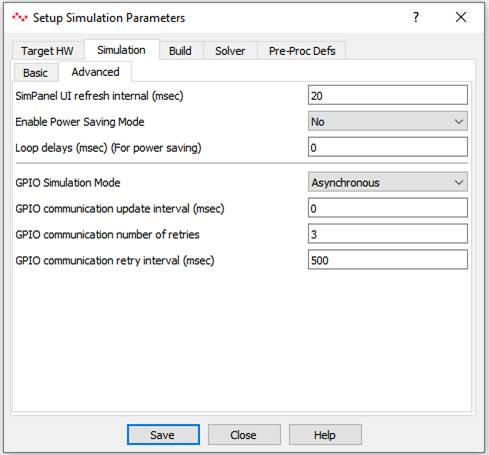 This option tells GPIO blocks during simulation on native hardware when to communicate with external connected hardware. Asynchronous: Communication to external hardware is not synchronized with simulation time step. Sync. Time Step: Communication to external hardware is synchronized with simulation time step. Sync. Plot Step: Communication to external hardware is synchronized with simulation plot step. (Default option) |