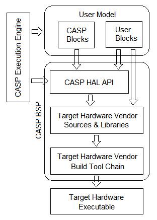 · CASP/User Block Code: This is the application level code created by the user during modelling in the form of blocks. CASP blocks calls CASP HAL APIs when interacting with hardware peripherals. However, user blocks can additionally call target hardware sources and libraries supplied by the hardware vendor if required. In such a case the implementation will be limited to a specific target.